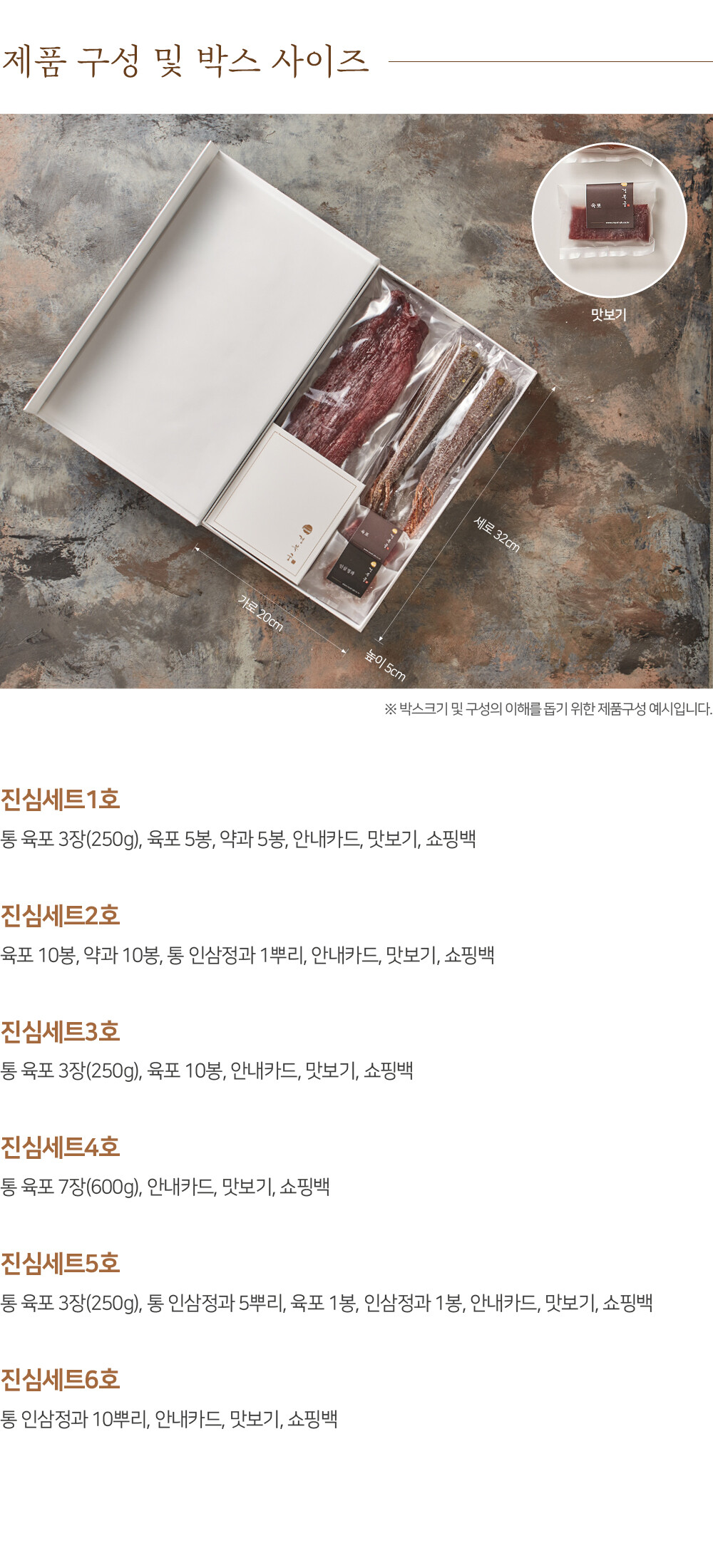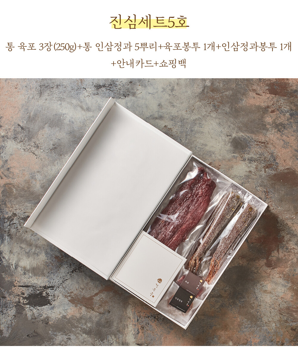통 육포 3장(250g)+통 인삼정과 5뿌리+육포봉투 1개+인삼정과봉투 1개+안내카드+쇼핑백